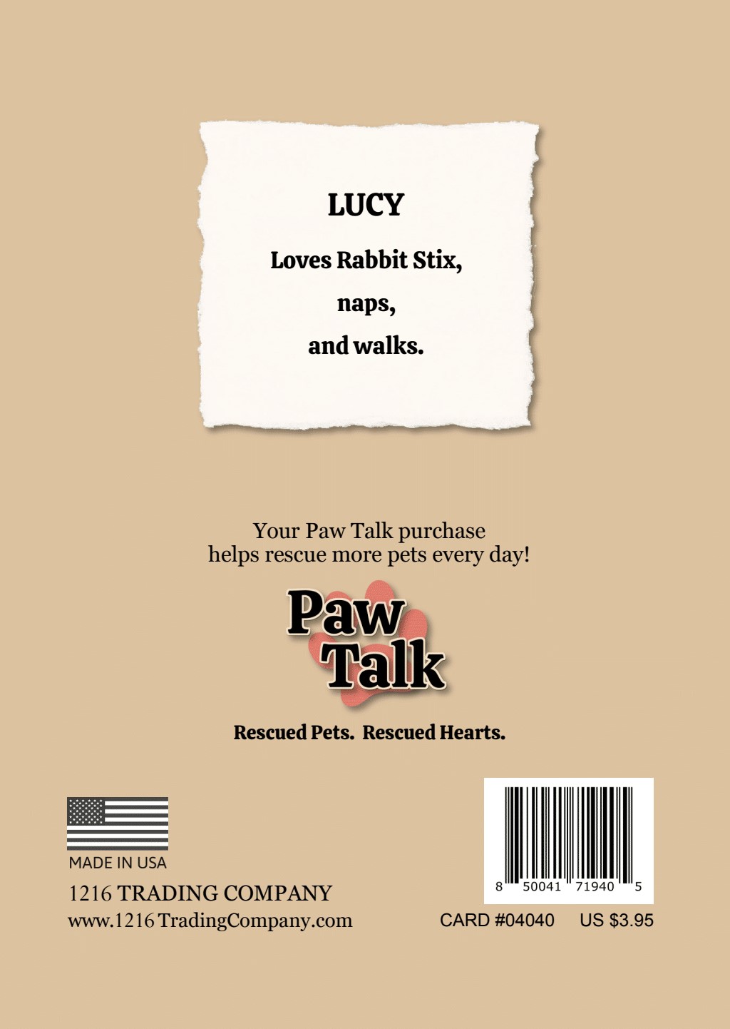Paw Talk Greeting Cards feature real rescued pets, and help raise money to support pet rescue organizations. Be sure to check out the quirky profiles on the back of each card!